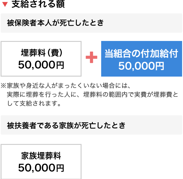被保険者本人が死亡した場合のみ、埋葬料付加金として50,000円が支給されます。