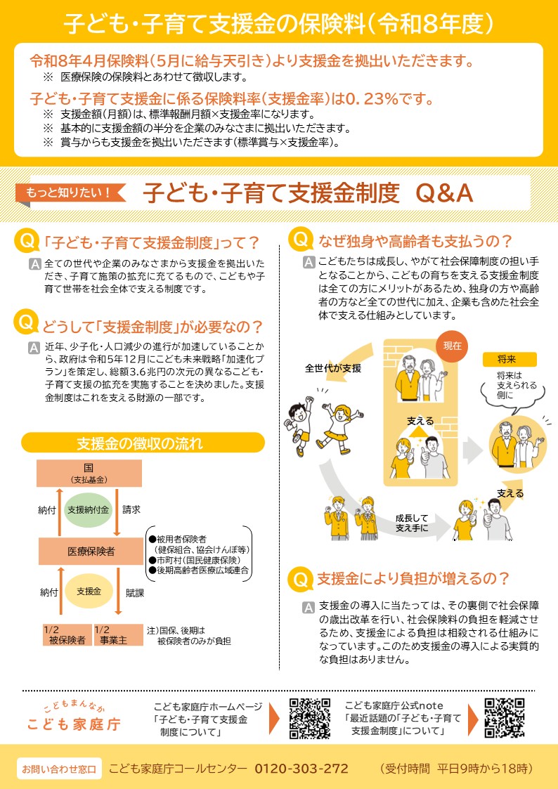 この度「子ども・子育て支援法等の一部を改正する法律」に基づき、令和8年度から「子ども・子育て支援金制度」が開始されます。つきましては、下記のとおりご案内申し上げます。